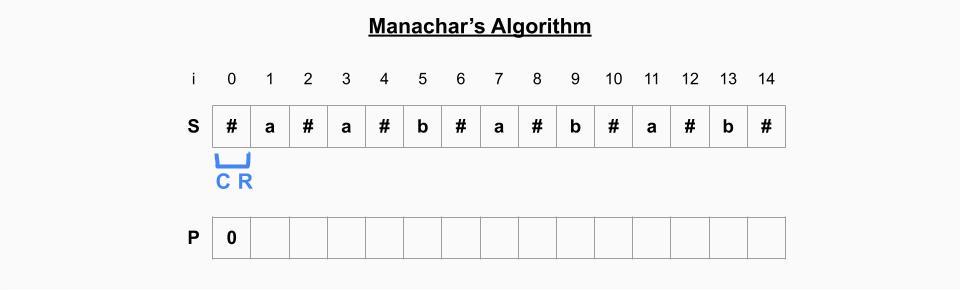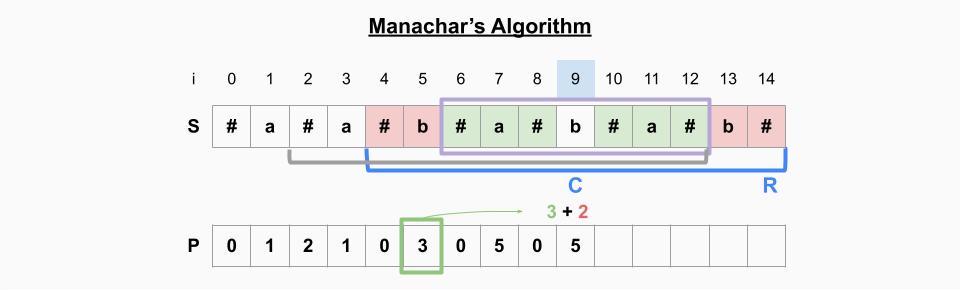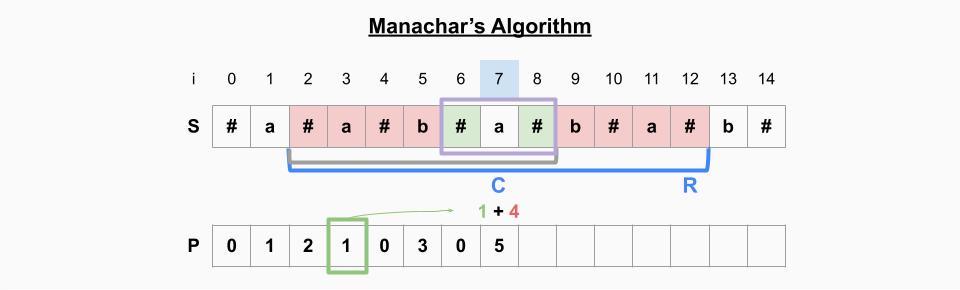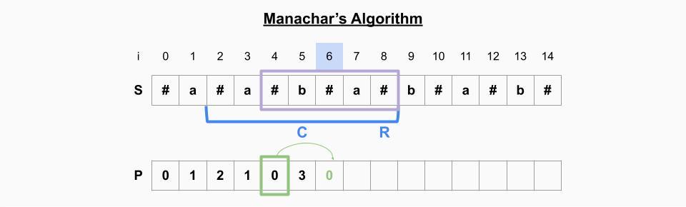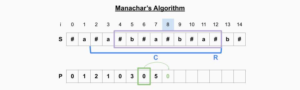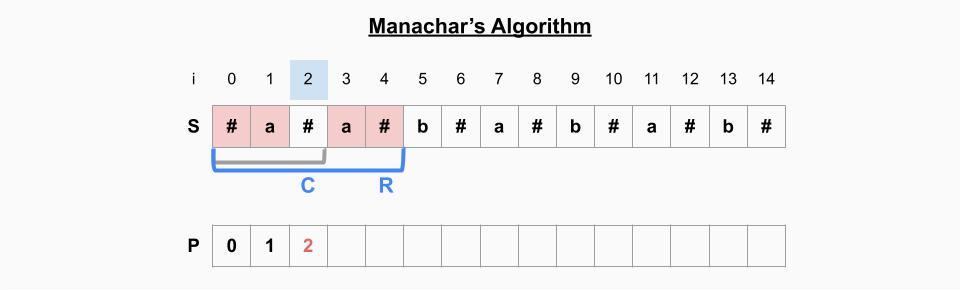 P[i] = min(R-i, P[2*C-i]) // 기존 palindrome 범위 내에 존재할 것을 보장하는 미러링 원소의 값을 택한다.