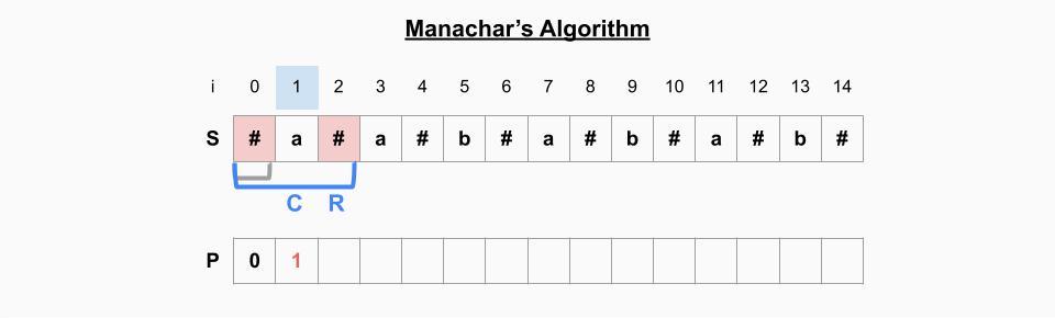 - 현재의 palindrome의 가장 오른쪽 인덱스(i=2)가 기존 palindrome의 가장 오른쪽 인덱스(i=0)보다 크기 때문에 새로 palindrome 범위를 업데이트 해준다. -> C=1, R=2