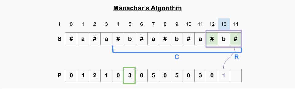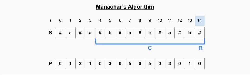 - 현재 palindrome의 오른쪽 인덱스(14)가 기존 palindrome의 오른쪽 인덱스(12)보다 크기 때문에 범위를 업데이트 한다. -> C=9, R=14