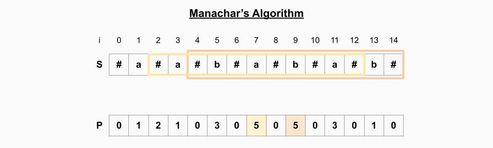 - 결과 배열 P가 최댓값을 기준으로 대칭을 이룬다. 모든 경우에 대칭을 이룰까? 그건 아니다. 여러 palindrome이 겹쳐져 있는 경우에 P는 대칭을 이루지 않는다. (예: #a#b#a#a#b#->P[0, 1, 0, 3, 0, 1, 4, 1, 0, 1, 0])