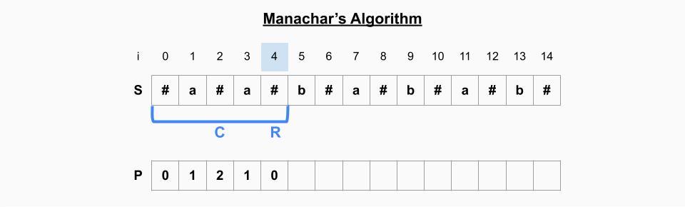 - 현재의 palindrome의 가장 오른쪽 인덱스(i=4)가 기존 palindrome의 가장 오른쪽 인덱스(i=2)보다 크기 때문에 새로 palindrome 범위를 업데이트 해준다. -> C=2, R=4